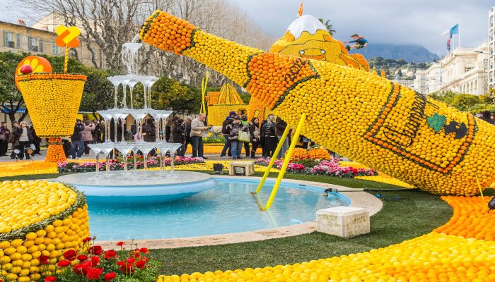 Unisciti a noi per vivere l’incanto della Festa dei Limoni di Mentone, uno degli eventi più spettacolari della Costa Azzurra. Ogni anno, questa celebrazione unica al mondo rende omaggio agli agrumi, trasformando la città in un’esplosione di colore e allegria. Le strade si riempiono di magnifiche sculture e carri interamente decorati con limoni e arance, vere e proprie opere d’arte che raccontano storie attraverso forme e temi ogni volta nuovi.